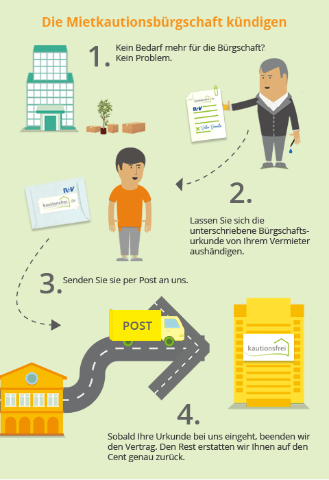 Bei einer Mietkautionsversicherung oder einem Bankaval ist der Ablauf dann wie folgt: Sind aus dem Mietverhältnis keine Forderungen entstanden, gibt der Vermieter Ihnen die Bürgschaftsurkunde unterschrieben zurück. Sie schicken die Urkunde dann an die Versicherung oder Bank zurück und kündigen damit die Bürgschaft.