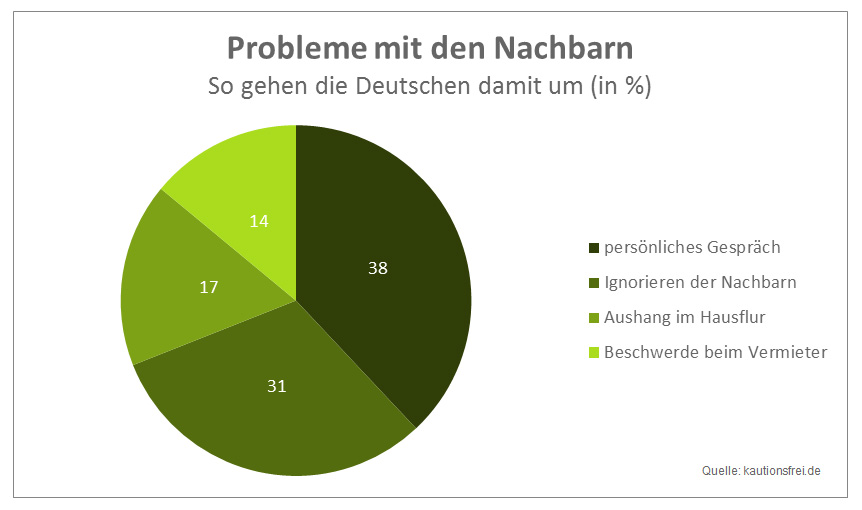 Solange die Störungen sich in Grenzen halten, gibt es keinen Grund für die genervten Nachbarn, aktiv zu werden. Die plusForta GmbH wollte aber auch wissen, welche Maßnahmen die Bewohner ergreifen, um den individuellen Hausfrieden wiederherzustellen, wenn ihnen die Beeinträchtigungen zu viel werden. Offenbar herrscht in deutschen Mehrfamilienhäusern ein offener Austausch der Nachbarn untereinander, denn 38 Prozent favorisieren ein persönliches Gespräch, um potenzielle Streitereien im Keim zu ersticken. Dies ist wesentlich konstruktiver als die Nachbarn einfach nur zu ignorieren, wofür sich immerhin ganze 31 Prozent entscheiden – eine Lösung für das „Problem“ kann so jedenfalls nicht gefunden werden. Langfristig führt der aufgestaute Ärger schlimmstenfalls zu unsachlichen Auseinandersetzungen. 17 Prozent der Befragten umgehen ein persönliches Gespräch; sie setzen stattdessen auf einen Aushang im Hausflur, der das eigene Missfallen zum Ausdruck bringen soll. Härtere Geschütze fahren indessen 14 Prozent der Facebook-Fans auf, indem sie mit einer Beschwerde den Vermieter involvieren und hoffen, dass er das Problem für sie löst.
